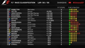 Πλέον ισοβαθμεί στην πρώτη θέση με τον Φέτελ ο οποίος σήμερα τερμάτισε στη δεύτερη θέση. Τρίτος αναδείχθηκε ο Φερστάπεν, ο οποίος ξεκίνησε από την 16η θέση.