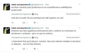 Λέγονται και γράφονται πολλά για την αποβολή του Αρουαμπαρένα. Ο Ισπανός επιθετικός τοποθετήθηκε στο twitter σχολιάζοντας πληροφορίες που φέρουν τον διαιτητή να έγραψε στο φύλλο αγώνος ότι τον εξύβρισε .