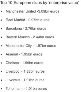 Η Πρέμιερ Λιγκ κυριαρχεί στη δεκάδα των ποδοσφαιρικών κλαμπ με τη μεγαλύτερη αξία, με τη Μάντσεστερ Γιουνάιτεντ να βρίσκεται στην κορυφή! Τα αποτελέσματα που άνέδειξε η έρευνα της KPMG για την αξία των ποδοσφαιρικών συλλόγων ως εταιρείες (KPMG Football Clubs’ Valuation report), κατατάσσει τους «κόκκινους διαβόλους» στην πρώτη θέση με 3.09 δισεκατομμύρια ευρώ, ενώ συνολικά οι έξι από τις 10 πρώτες θέσεις ανήκουν σε αγγλικά κλαμπ.
