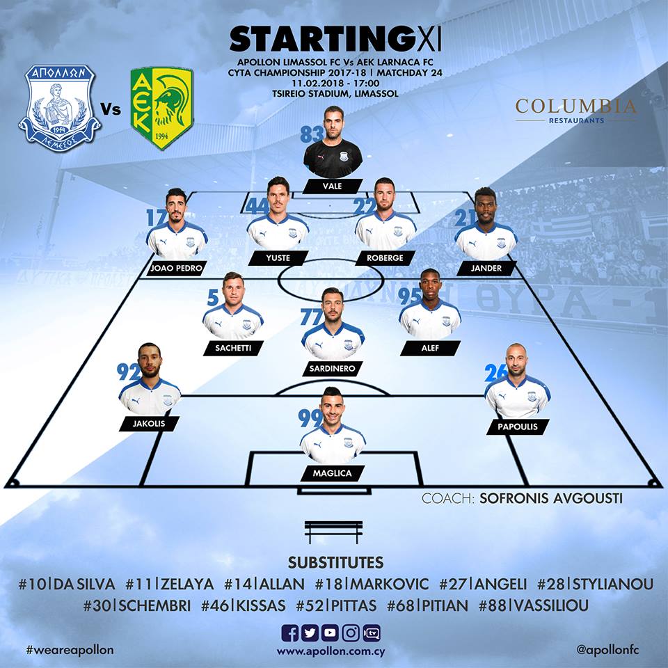 Στον πάγκο οι: Κίσσας, Άλεξ, Ζελάγια, Άλαν, Μάρκοβιτς, Αγγελή, Στυλιανού, Σκέμπρι, Πίττας, Πιτσιάν, Βασιλείου.