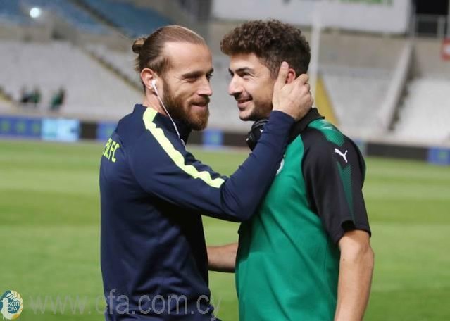 Νεκτάριος Αλεξάνδρου και Δημήτρης Χριστοφή σε όμορφο στιγμιότυπο πριν το ντέρμπι του πρώτου γύρου μεταξύ της Ομόνοιας και του ΑΠΟΕΛ.