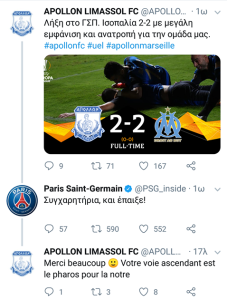 Η Παρί Σεν Ζερμέν μετά την ισοπαλία του Απόλλωνα με τη Μαρσέιγ απάντησε σε tweet της κυπριακής ομάδας δίνοντας της στα ελληνικά τα συγχαρητήριά για την ισοπαλία.