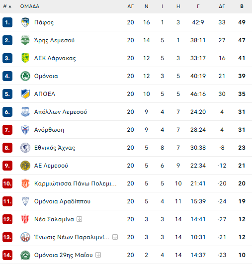 Πάφος FC και Άρης προελαύνουν και συνεχίζουν να οδηγούν την κούρσα (η Πάφος FC 1η και ο Άρης 2ος) ανοίγοντας μάλιστα την διαφορά από την 3η θέση.