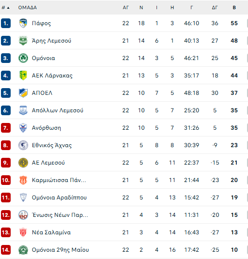 Με τρεις αγώνες ολοκληρώνεται το βράδυ της Κυριακής (9/2) η 22η της Cyprus League By Stoiximan. Ξεχωρίζει η αναμέτρηση στο στάδιο «Αλφαμέγα» ανάμεσα στον Άρη και την ΑΕΚ (19:00). Οι γηπεδούχοι θέλουν νίκη για να παραμείνουν στην 2η θέση και να μην αυξηθεί περαιτέρω η διαφορά από την κορυφή, οι φιλοξενούμενοι θα επιδιώξουν να νικήσουν για 2η φορά φέτος τον Άρη και να πάνε στο -1 από τον αποψινό αντίπαλο τους!Kαι φυσικά για να περάσουν ξανά στην 3η θέση ,πάνω από την Ομόνοια που μετά τη δική της νίκη περιμένει το σημερινό αποτέλεσμα για να επωφεληθεί. Με νίκη της ΑΕΚ η Ομόνοια θα είναι 4η αλλά πιο κοντά στη 2η θέση ενώ με νίκη του Άρη θα παραμείνει στην 3η θέση.Τυχόν Χ θα είναι το καλύτερο για την Ομόνοια