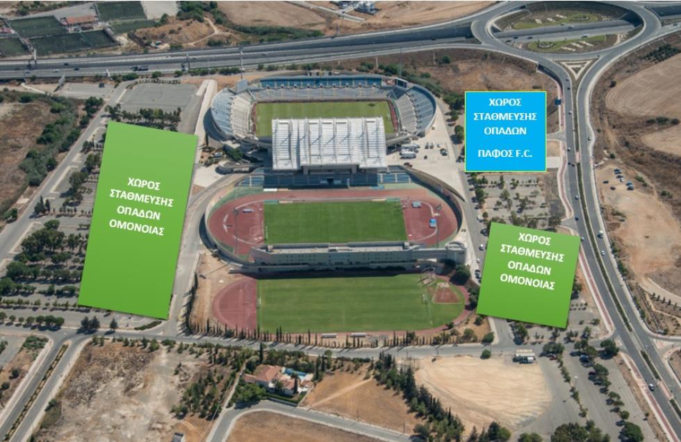 Οι φίλαθλοι της ΟΜΟΝΟΙΑΣ θα καταλάβουν τις Δυτικές, Βόρειες και Ανατολικές κερκίδες του σταδίου, ως εκ τούτου προτρέπονται να κατευθυνθούν στο στάδιο μέσω της λεωφόρου Σπύρου Κυπριανού και των φώτων τροχαίας «Ορφανίδη». Να σταθμεύσουν τα οχήματα τους στους χώρους στάθμευσης οχημάτων.