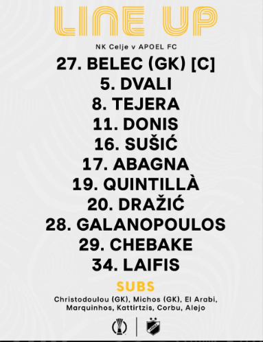 Ο προπονητής του ΑΠΟΕΛ Μανόλο Χιμένεθ παρατάσσει την ακόλουθη 11άδα στο παιχνίδι με την Τσέλιε:(19:45 ΡΙΚ)