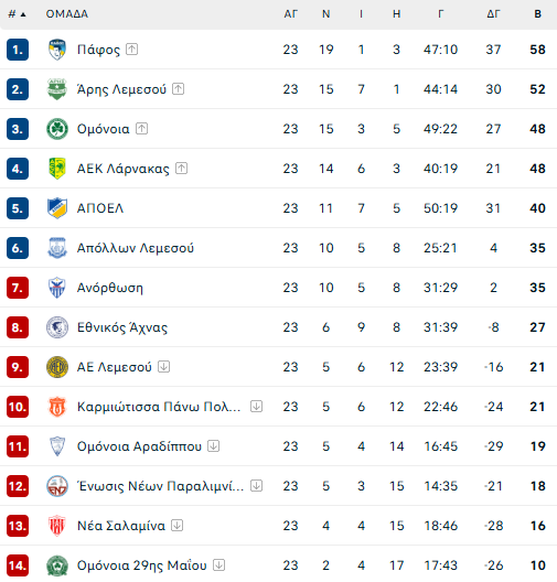 Όπως είναι γη βαθμολογία σήμερα τρεις αγώνες πριν την λήξη της Α΄ φάσης οι 7 ομάδες της οκτάδας είναι δεδομένες και η 7η θα είναι μία εκ της Ανόρθωσης και του Απόλλωνα με λίγες πιθανότητες να είναι το ΑΠΟΕΛ σύμφωνα με τις μαθηματικές πράξεις.