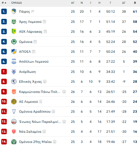 Ο Απόλλωνας υποδέχεται τη Νέα Σαλαμίνα στο στάδιο ΑΛΦΑΜΕΓΑ και με νίκη θα ελπίζει στην 5η θέση ενώ οι ερυθρόλευκοι δίνουν μάχη σωτηρίας.Η ουραγός Ομόνοια 29ης Μαΐου υποδέχεται την Ανόρθωση στην Περιστερώνα και θέλει τους βαθμούς για να πάει στη β΄φάση με ελπίδες παραμονής ενώ η Ανόρθωση θα παίξει για ττο γόητρο της.
