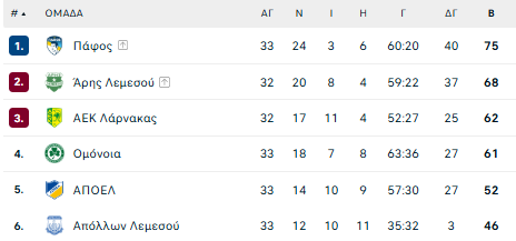 Για την ώρα παραμένει μεγάλο φαβορί για τον τίτλο η Πάφος και η ΑΕΚ έχει το προβάδισμα για την 3η θέση.Αν μπορεί έστω θεωρητικά να αλλάξει κάτι θα το μάθουμε το βράδυ μετά τον αγώνα στη Λεμεσό