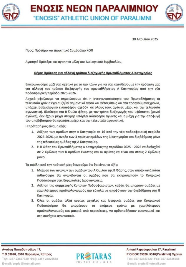 Η κουβέντα για αύξηση των ομάδων στην Α’ Κατηγορία φαίνεται πως περνά σε πιο «επίσημη» φάση, καθώς η Ένωση Νέων Παραλιμνίου έκανε το πρώτο βήμα στέλνοντας επιστολή στην ΚΟΠ, μέσω της οποίας καταθέτει ολοκληρωμένη πρόταση για αλλαγή του πλάνου διεξαγωγής του πρωταθλήματος από τη σεζόν 2025-2026.