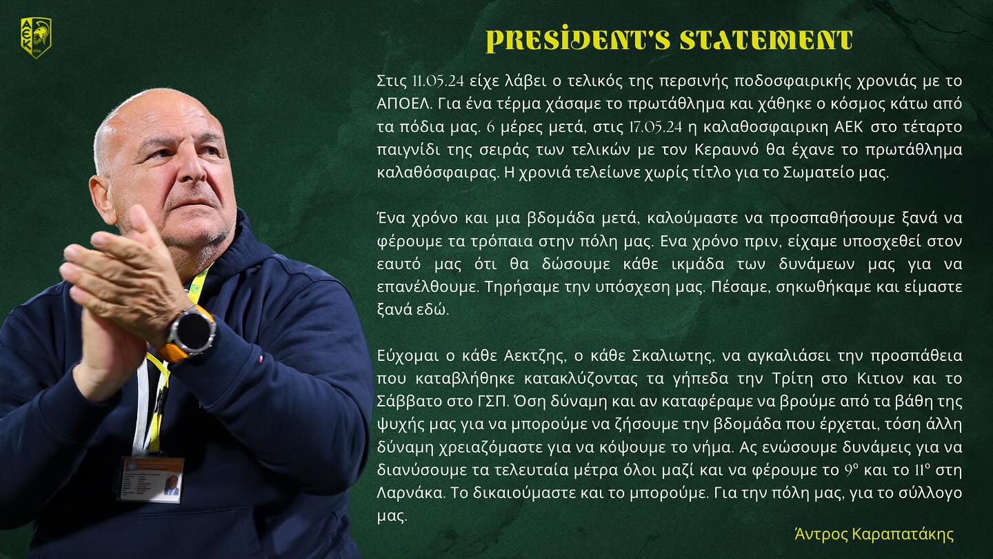 Γραπτή δήλωση του προέδρου της ΑΕΚ κ.Α.Καραπατάκη :
