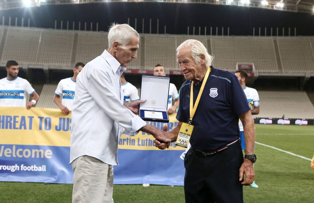 Η φωτογραφία είναι από φιλικό της ΑΕΚ Αθηνών με τον Απόλλων το 2021 πριν την έναρξη του οποίου τιμήθηκε ο Πανίκος Κρυστάλλης