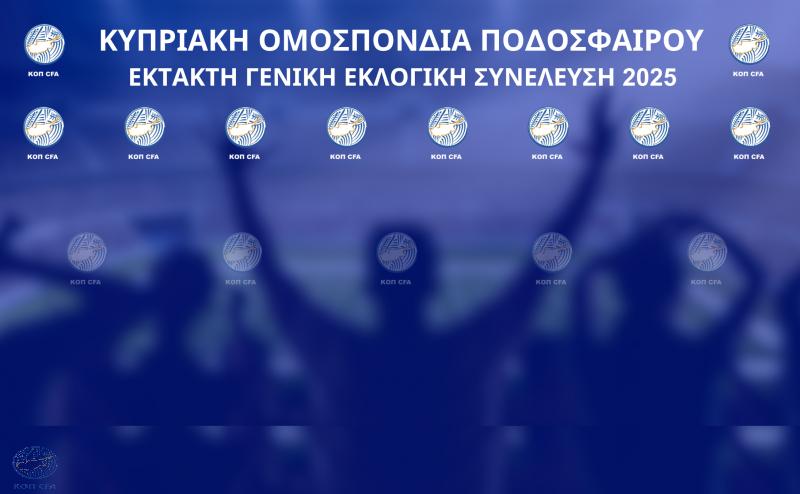 Πραγματοποιείται την Τρίτη 24 Ιουνίου η Έκτακτη Γενική Εκλογική Συνέλευση της Κυπριακής Ομοσπονδίας Ποδοσφαίρου. Η Συνέλευση θα γίνει στις 12:00 το μεσημέρι στο ξενοδοχείο Hilton στη Λευκωσία.