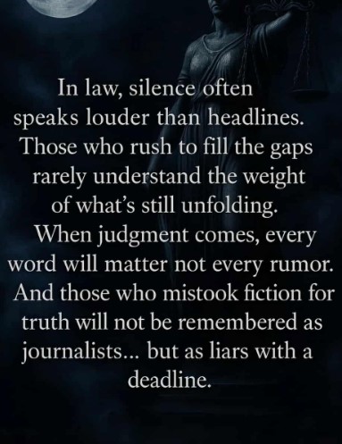 “Στο δίκαιο, η σιωπή συχνά μιλάει πιο δυνατά από τους τίτλους. Όσοι βιάζονται να καλύψουν τα κενά σπάνια καταλαβαίνουν το βάρος αυτού που εκτυλίσσεται ακόμα. Όταν έρθει η κρίση, κάθε λέξη θα έχει σημασία, όχι κάθε φήμη. Και όσοι μπέρδεψαν τη μυθοπλασία με την αλήθεια δεν θα μείνουν στη μνήμη μας ως δημοσιογράφοι… αλλά ως ψεύτες με προθεσμίες.