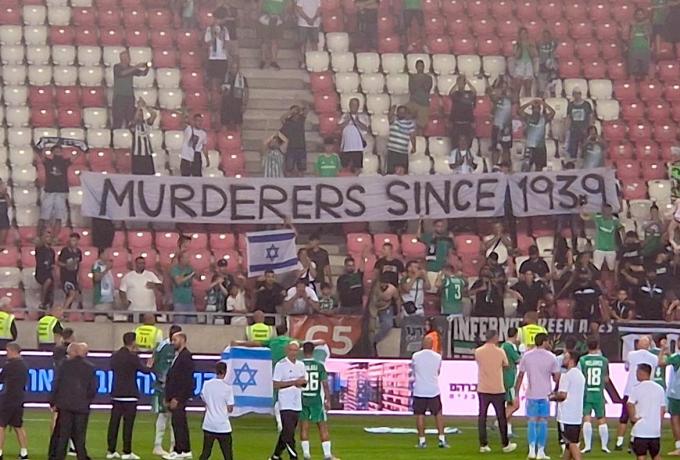 Ισραηλινοί οπαδοί σήκωσαν ένα πανό που έγραφε «Δολοφόνοι από το 1939» κατά τη διάρκεια ενός αγώνα οπαδούς της ισραηλινής ομάδας Μακάμπι Χάιφα εναντίον της Ρακόφ Τσεστοχόβα για το Conference League ο οποίος παίχτηκε στο Ντέμπρετσεν της Ουγγαρίας για λόγους ασφαλείας.