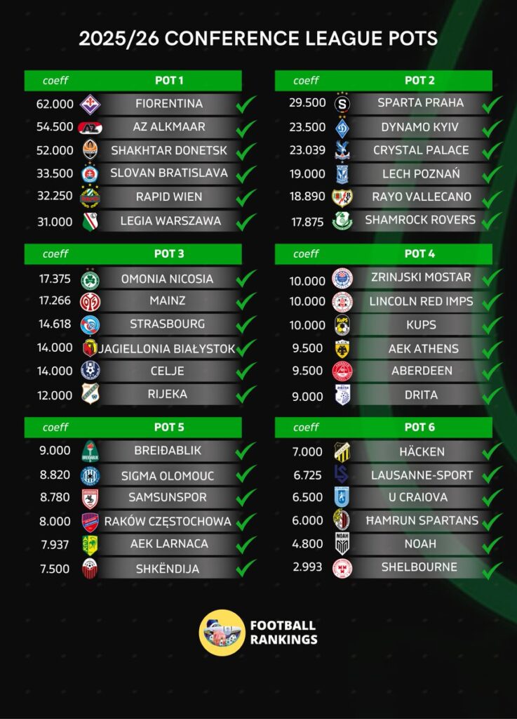 Oι 36 ομάδες της League Phase του Conference League και τα group δυναμικότητας. Στο 3ο η Ομόνοια στο 5ο η ΑΕΚ Λάρνακας στο 4ο η ΑΕΚ Αθηνών