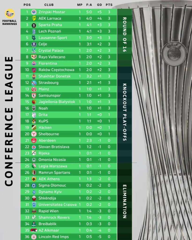 • Η βαθμολογία του Conference League και τα αποτελέσματα της 1ης αγωνιστικής.Στην 2η θέση η ΑΕΚ ,24η η Ομόνοια