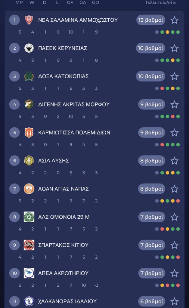 Έδωσε συνέχεια στο αήττητο της σερί η Νέα Σαλαμίνα που νίκησε εκτός έδρας με 4-1 τη ΜΕΑΠ και είναι μόνη (με αγώνα περισσότερο) στην 1η θέση με 13 βαθμούς. Σπουδαίο «διπλό» με 2-0 πήρε και η Δόξα Κατωκοπιάς κόντρα στον Διγενή Μόρφου, όπως επίσης η ΑΠΕΑ απέναντι στον Αχυρώνα/Ονήσιλο (1-0) και η Αγία Νάπα επί του Ηρακλή (4-2). Στην έδρα του ο Χαλκάνορας επικράτησε με 4-2 του Εθνικού Λατσιών.