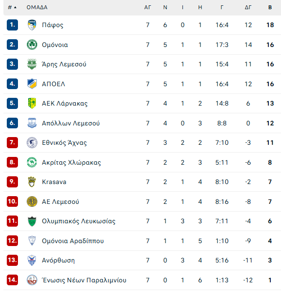 Με δύο αναμετρήσεις ανοίγει σήμερα η αυλαία της 8ης αγωνιστικής της Cyprus League by Stoiximan. O Εθνικός υποδέχεται στο Δασάκι την ΕΝΠ,και θέλει τη νίκη για να νιώθει άνετα στη βαθμολογία ενώ η Ένωση κυνηγά την πρώτη της νίκη. Στο πιο άλλο παιχνίδι της ημέρας στο ΓΣΠ ο Ολυμπιακός θα φιλοξενήσει τον Απόλλωνα σε μια αναμέτρηση κλειδί για τον μέλλον των δύο ομάδων για τους στόχους που έχουν