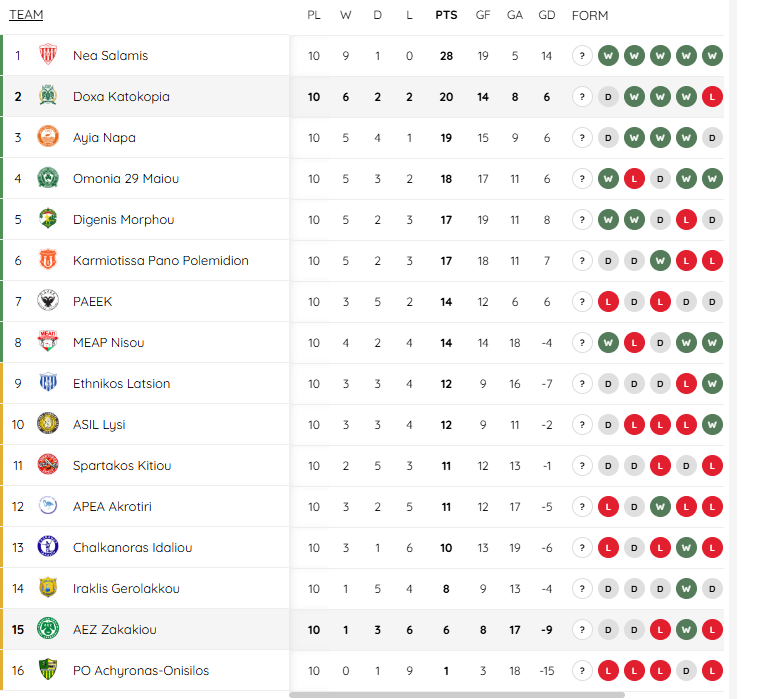 Η Δόξα είναι στην 2η θέση με 20 βαθμούς,(η Ν.Σαλαμίνα πρώτη με 28) ενώ η ΑΕΖ Ζακακίου παραμένει στην προτελευταία θέση με 6 βαθμούς.