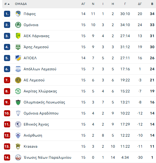 Η Ομόνοια Αρ. έχει 14 βαθμούς και η ΕΝΥ 11