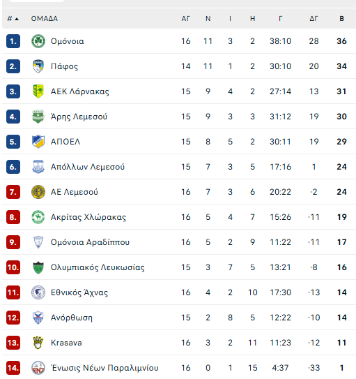 Στις 19:00 ο Απόλλωνας θα αναμετρηθεί με την Πάφος FC στο στάδιο «ΑΛΦΑΜΕΓΑ» και θα προσπαθήσει να έχει βαθμολογικό κέρδος. Στον πρώτο γύρο ο Απόλλωνας κέρδισε μέσα στην έδρα της αντιπάλου του που έχει και επιπρόσθετη πίεση τη νίκη της Ομόνοιας που την ξεπέρασε στην κορυφή ενώ υπάρχει και το ενδεχόμενο ο αγώνας να είναι ο τελευταίος του Καρσέδο στον πάγκο αφού οι πληροφορίες λένε ότι θα πάει στην Σπαρτάκ Μόσχας. Ανεξάρτητα από όλα αυτά η Πάφος έχει ποιοτικό ρόστερ και θέλει να ανακτήσει την κορυφή με μια νίκη εκτός έδρας υψηλού βαθμού δυσκολίας