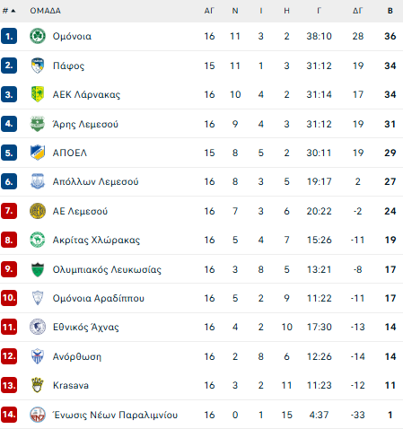 Ανοίγει η αυλαία της 17ης αγωνιστικής της Cyprus League by Stoiximan με το ντέρμπι στο στάδιο ΑΛΦΑΜΕΓΑ, όπου η ΑΕΛ υποδέχεται την Ομόνοια. Οι «γαλαζοκίτρινοι» είναι στην 7η θέση με 24 βαθμούς και οι «πράσινοι» στην 1η με 36.