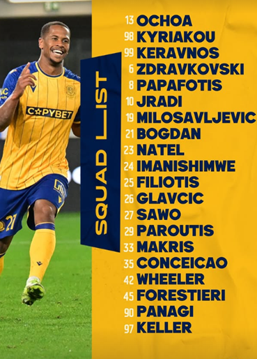 Εκτός έμειναν οι Σινγκ και Στεφάνοβιτς λόγω συμπλήρωσης καρτών, ενώ οι Φεριέρ, Ουεντραόγκο, Νεοφύτου και Φραντζής δεν συμπεριλαμβάνονται στην αποστολή. Απρόοπτο της τελευταίας στιγμής προέκυψε με τον Ζόκε, ο οποίος έμεινε εκτός λόγω οιδήματος στην ποδοκνημική.