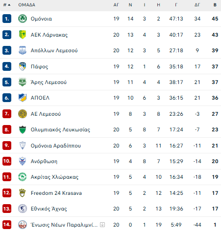 Ανοιχτό ντέρμπι στη Λεμεσό, φαβορί η Ομόνοια, σημαντική μονομαχία Ακρίτα-Ανόρθωσης (βαθμολογία -συνέχεια)