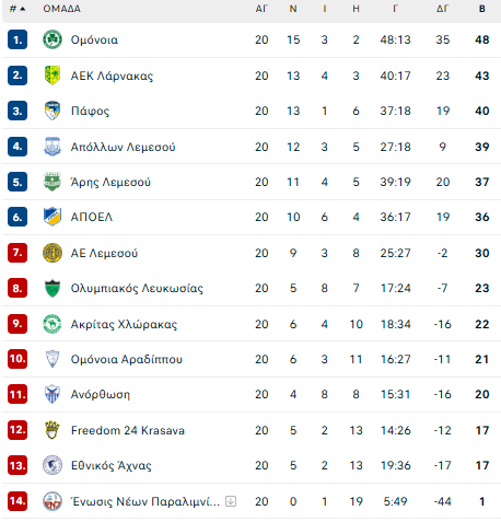 19:00 Απόλλων Λεμεσού – Ολυμπιακός Λευκωσίας(Cytavision)