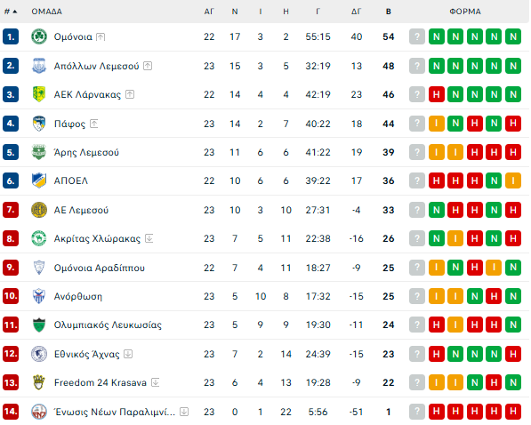 Ο Απόλλωνας πιο ψηλά,έχασε έδαφος η Πάφος.Κερδισμένοι Ακρίτας-Ανόρθωση στο β΄όμιλο(Βαθμολογία-συνέχεια)