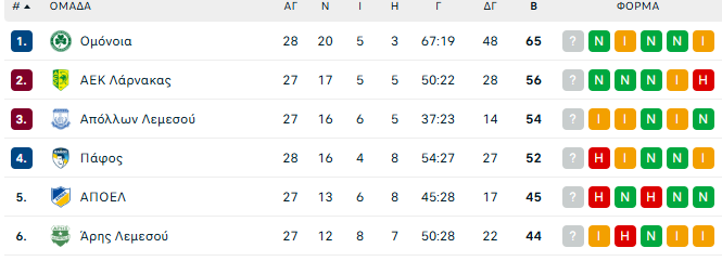 Ο νικητής στο σημερινό ντέρμπι θα πάρει προβάδισμα για την 2η θέση και θα δημιουργήσει μαξιλαράκι ασφάλειας από την 4η θέση όπου έμεινε η Πάφος με 52 βαθμούς.