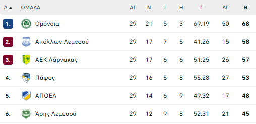 • Η Ομόνοια για να σφραγίσει τον τίτλο,το ΑΠΟΕΛ για το γόητρο.Με φόντο την τριάδα Πάφος-ΑΕΚ και Άρης-Απόλλων (πρόγραμμα-Βαθμολογίες)