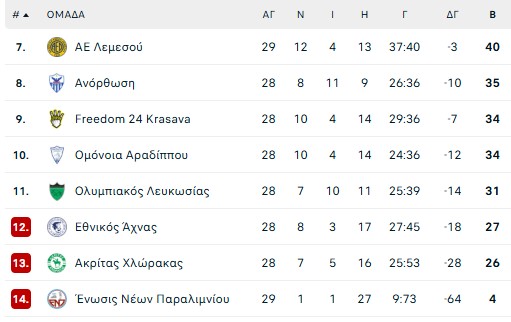Στις 17:00 η Ανόρθωση, υποδέχεται την Ομόνοια Αραδίππου. Και οι δυο επιδιώκουν επάνοδο στις επιτυχίες.Η Ανόρθωση νιώθει περισσότερη ασφάλεια και σιγουριά αλλά θα επιδιώξει τη νίκη για να ανέβει στην πρώτη θέση του ομίλου. Η βαθμολογία δείχνει ότι και η Ομόνοια Αρ έχει μαξιλαράκι ασφάλειας ωστόσο αν χάσει σε συνδυασμό με τυχόν άλλα αποτελέσματα μπορεί να ξαναμπλεχτεί σε περιπέτειες