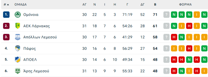 Στο στάδιο Αλφαμέγα, στο τελευταίο ματς της ημέρας, ο Απόλλωνας υποδέχεται την επίδοξη και σίγουρη πρωταθλήτρια Ομόνοια. Οι γαλάζιοι με νίκη θα πιάσουν ξανά στη βαθμολογία την ΑΕΚ και θα πάνε με καλή ψυχολογία στο ΓΣΠ για τον επαναληπτικού κυπέλλου, ενώ οι πράσινοι με διπλό επαναφέρουν τη διαφορά στο +13 και θα συνεχίσουν να περιμένουν τη στέψη και μαθηματικά.