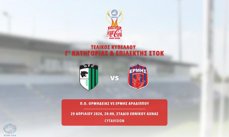 Το τρόπαιο θα διεκδικήσουν ο Ποδοσφαιρικός Όμιλος Ορμήδειας και ο Ερμής Αραδίππου, που κατάφεραν να εξασφαλίσουν συμμετοχή για πρώτη φορά στον τελικό των Μικρών μας Κατηγοριών.