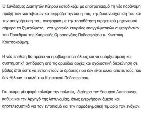 Την βομβιστική επίθεση εναντίον γραφείων εταιρείας συμφερόντων του προέδρου της ΚΟΠ Κωστάκη Κουτσοκούμνη καταδικάζει με ανακοίνωση του και ο Σύνδεσμος Διαιτητών Κύπρου που καλεί την αστυνομία και τον Υπουργό Δικαιοσύνης να δράσουν άμεσα και να εξιχνιάσουν την υπόθεση.
