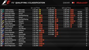 Μετά από πέντε χρόνια στη Formula 1, ήρθε η ώρα για τον Βάλτερι Μπότας να κερδίσει την πρώτη του pole position. Στις κατατακτήριες του Μπαχρέιν ο πιλότος της Mercedes ήταν ο ταχύτερος όλων αφήνοντας δεύτερο τον ομόσταβλό του, Λιούις Χάμιλτον, και τρίτο τον Σεμπάστιαν Φέτελ με Ferrari, ενώ Ντάνιελ Ρικιάρντο με Red Bull και Κίμι Ραϊκόνεν με το δεύτερο μονοθέσιο της «σκουντερία» ακολούθησαν στην πεντάδα.