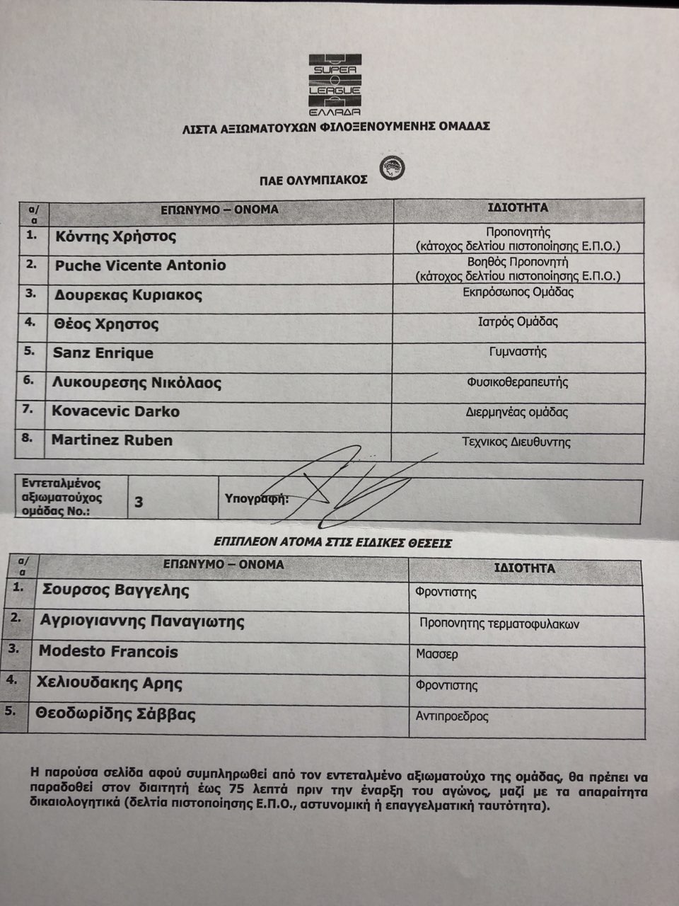 Στο «φύλλο αγώνα», επίσης, αναφέρεται ότι ο Καταλανός προπονητής του Ολυμπιακού ζήτησε να πάει για περαιτέρω εξετάσεις στο νοσοκομείο μαζί με το γιατρό του Ολυμπιακού ως εκ τούτου δεν μπορούσε να τελεστεί ο αγώνας.