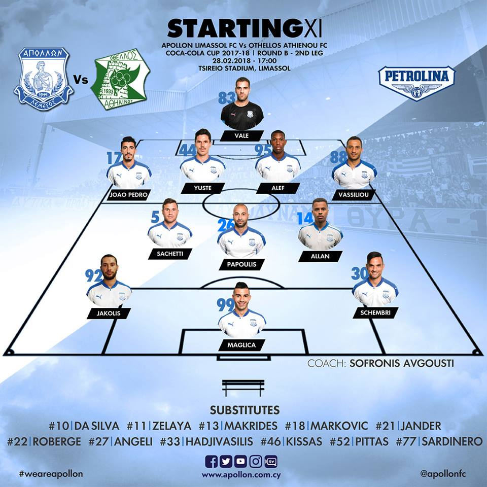 ΑΠΟΛΛΩΝΑΣ: Βάλε, Πέδρο, Γιούστε, Ρομπέρζ, Ζάντερ, Άλαν, Άλεφ, Ντα Σίλβα, Σκέμπρι, Σαρντινέρο και Ζελάγια.